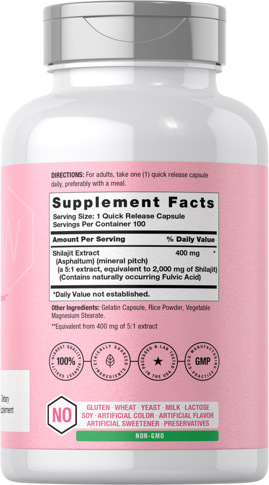 Horbaach Shilajit: At Horbaach, quick release capsules feature the equivalent of 2,000 mg of Shilajit for daily support.** Our highly innovative supplement is gluten free, non-GMO, and lab tested for exceptional quality, making it the perfect choice for men and women everywhere. Enjoy our 100-capsule supply!